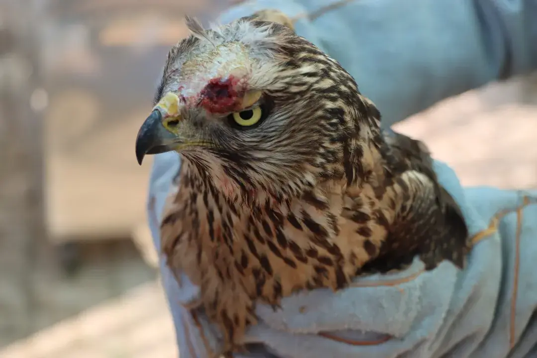 据龙女士描述,事发当日,这只苍鹰坠入自家院中,因受惊剧烈挣扎导致头部撞击受伤,渗出明显血迹。发现这一情况后,龙女士立即联系乡政府寻求帮助。区自然保护地管理处工作人员赶赴现场,对苍鹰进行初步检查后,将其带回救助中心治疗。